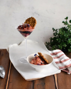 ビルベリータルトのジェラートと香ばしいオーツクッキー、ベリーのコンフィを散りばめ、
